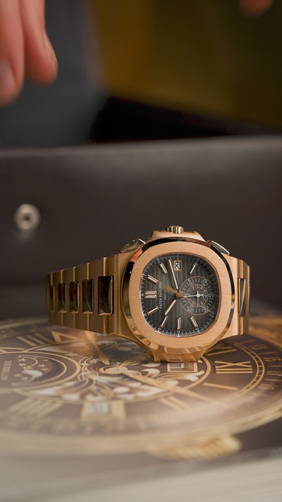 The Patek Philippe Nautilus 5980/1R-001 is a luxurious blend of sporty design and refined craftsmanship. Crafted from 18k rose gold, the 40.5mm case houses a black dial with horizontal embossing, featuring gold-applied hour markers with luminescent coating for enhanced visibility. The dial also includes a date display at 3 o'clock and a chronograph monocounter at 6 o'clock, combining 60-minute and 12-hour counters.