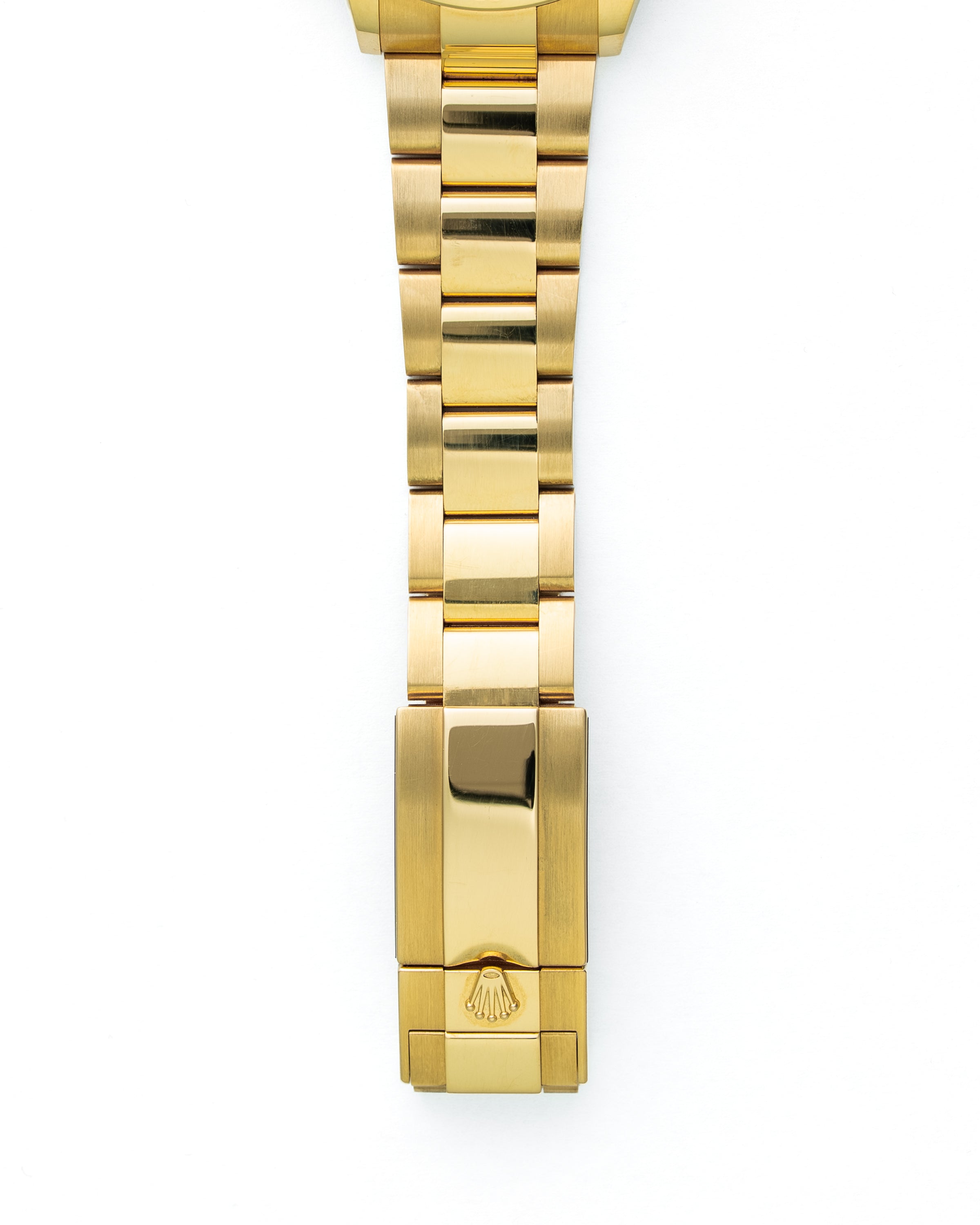 The bracelet is Rolex’s Oyster design, made entirely from yellow gold. It closes with the Oysterlock safety clasp and includes the Easylink comfort extension. The fit is perfect, the weight is satisfying, and the look is unmistakable.